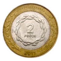 7.20 g., Bi-Metallic Copper-Nickel center in Aluminum-Bronze ring, 24.5 mm. Argentina 2012 UNC Edge: Reeded